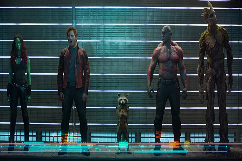 Em “Guardiões da Galáxia” (2014) conhecemos a equipa de Star-Lord (Chris Pratt), a Gamora (Zoe Saldana), o Drax (Dave Bautista), o Rocket (Bradley Cooper) e o Groot (Vin Diesel). Um grupo criminosos intergalácticos com um humor muito aguçado e sem nada a perder que se conhecem numa prisão. Juntos vão evitar que um guerreiro fanático controle o universo. A parte mais importante do filme é a Pedra do Poder. Os Guardiões da Galáxia terão de a proteger das mãos do inimigo Ronan e principalmente de Thanos. Na cena pós-créditos o “Colecionador” volta a aparecer. O seu espaço de relíquias está completamente destruído, só pode significar que a Pedra do Infinito foi roubada. [/tie_slide]